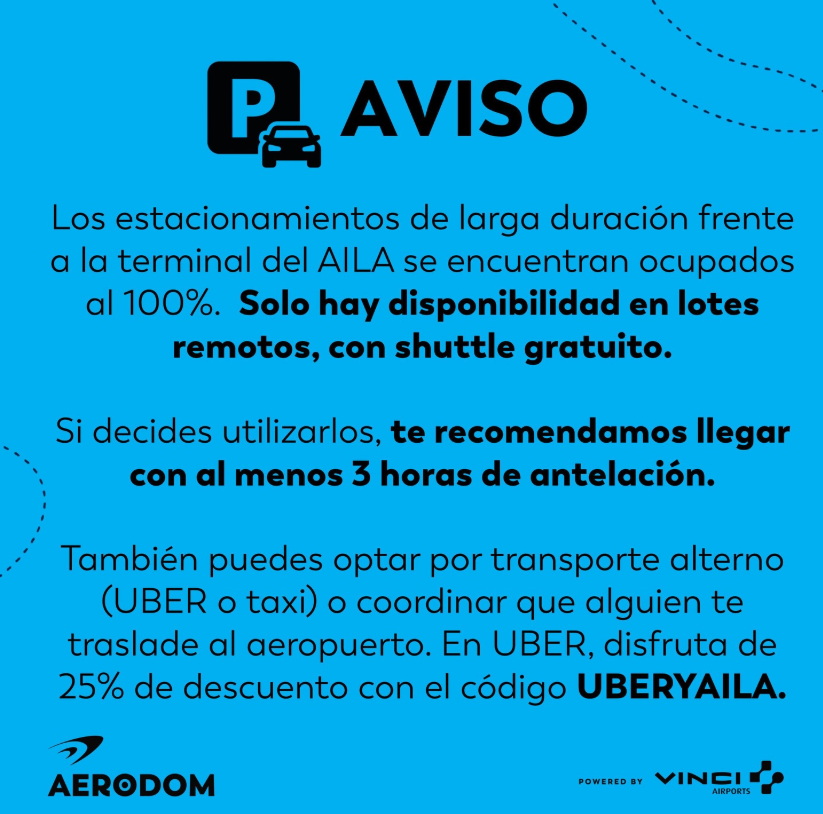La información fue dada a conocer por Aeropuertos Dominicanos Siglo XXI (Aerodom), entidad que administra la terminal, la cual explicó que, ante la alta demanda, solo hay disponibilidad en los lotes remotos, los mismos cuentan con servicio de shuttle gratuito para trasladar a los viajeros hasta el edificio principal.