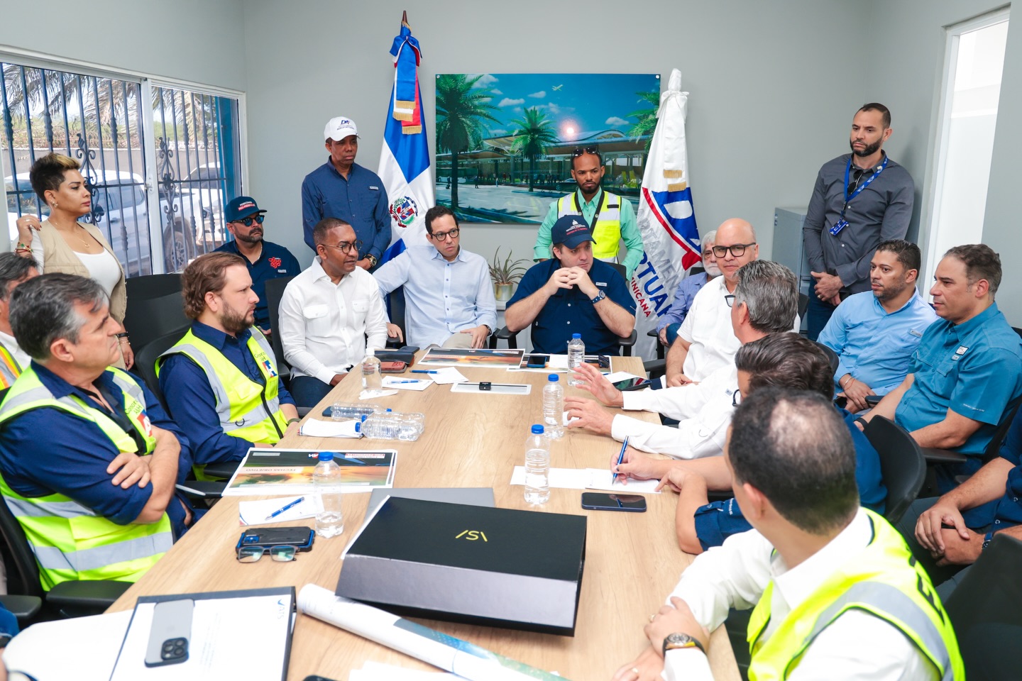Previo al recorrido, encabezó una mesa de trabajo junto con las instituciones, entidades, empresas contratistas, así como el socio privado del proyecto, donde se verificó cada proceso de la obra y su interacción entre estos, así como se estuvieron afinando los cronogramas y el plan de acción que corresponda, “de manera que podamos tener en los tiempos debidamente previstos y diseñados, la entrada en funcionamiento de este parque aéreo”.
