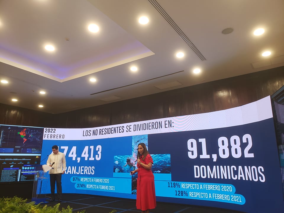 Indicó que en febrero de 2022 llegaron al país 4,300 vuelos de 130 líneas aéreas diferentes, siendo el aeropuerto de mayor tráfico el Aeropuerto Internacional de Punta Cana y el Aeropuerto de La Romana el de mayor crecimiento. Mientras que por la vía marítima se registraron 93 operaciones de cruceros en las cuales llegaron al país 169 mil no residentes, siendo el principal puerto el de Amber Cove, en Maimón, Puerto Plata.