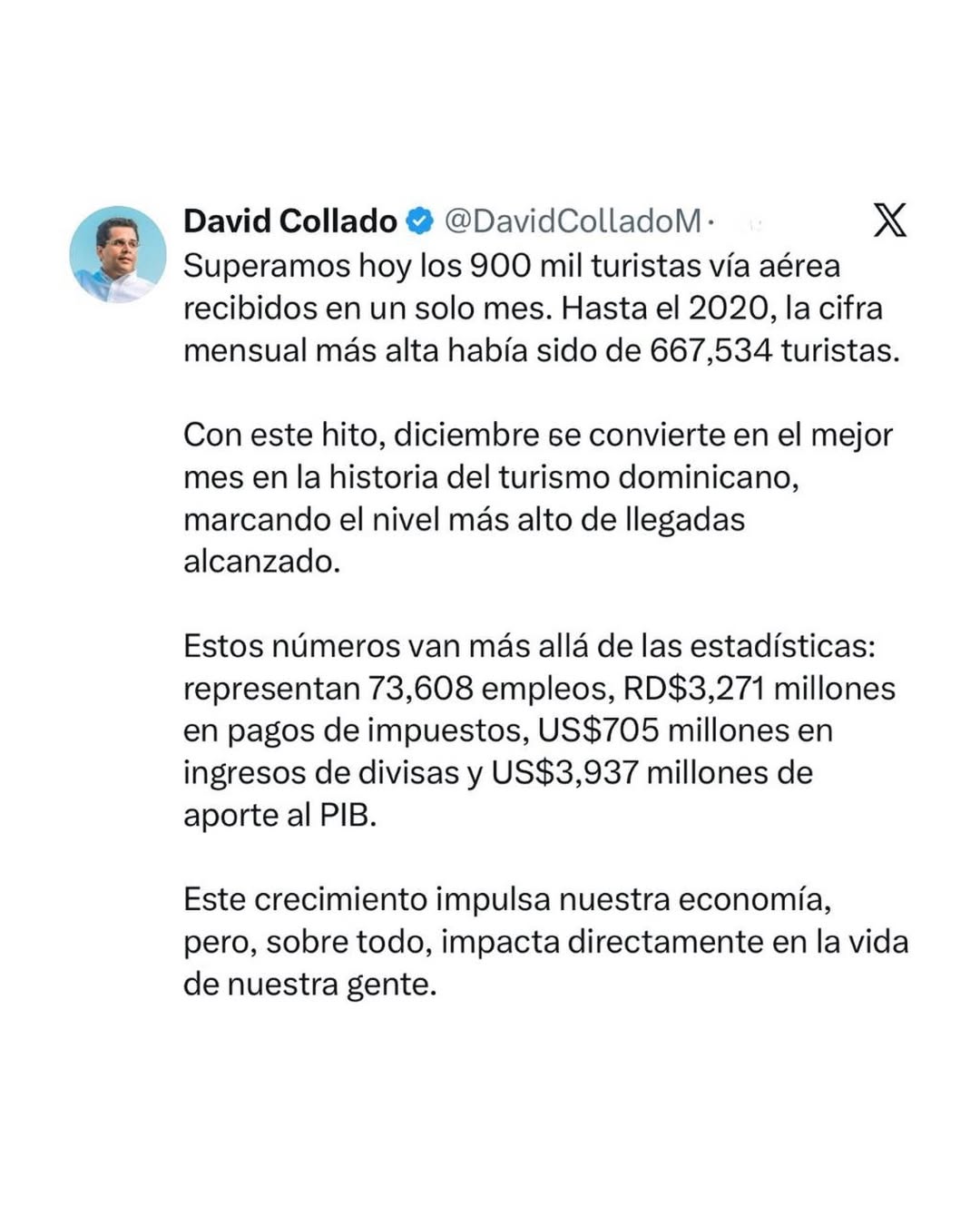 El ministro de Turismo, David Collado, sostuvo que la República Dominicana superó los 900 mil turistas vía aérea recibidos en el mes de diciembre 2025, lo que supone una cifra superior a la del 2020 (667,534 turistas).