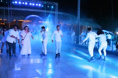 La lluvia no impidió que la fiesta en la playa de Paradisus Punta Cana se interrumpiera. Todos vestidos de blanco bailaron y disfrutaron de un espectáculo que combinó las olas del mar con una temática de invierno, en la que los participantes sentían que la nieve era parte del lugar. Todo fue en un estilo “Frozen”.