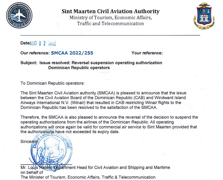 La Autoridad de Aviación Civil de Sint Maarten (SMCAA) anunció que el problema entre la Junta de Aviación Civil de la República Dominicana (JAC), ha sido resuelto y revocan la decisión de suspender los vuelos entre las islas.